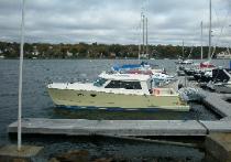See where the voyage began: Armdale Yacht Club, Halifax First Voyage on Anna: Halifax to Portland October 25, 2006 I am at present in Southwest Harbor on Mount Desert Island, Maine, waiting out a Small Crafts Advisory before moving on to Portland. My boat was delayed because of the engine controls, the original of which didn't suit me, so we had a good wait for the new ones to be installed. There are controls both at the helm in the pilothouse and outside in the cockpit. I finally left Halifax, Nova Scotia just a few days ago. I was dying to get away and left even though the weather wasn't good. It was overcast and the wind was howling, but the weatherman said it would lessen in the afternoon and then pretty much die at night. So I took a nap at lunch and left at 1:30 pm, the waves in Halifax harbour not bad at all, but they worsened some as I reached the headland at the entrance to the harbour, then in the open sea they were really nasty and I endured a very bumpy ride for about three hours. Finally I got behind some islands that offered some protection and then sped up as I wanted to reach my destination -- Lunenburg -- before dark. Although the ride was extremely uncomfortable, a worse thing was that my dinghy -- stowed along the transom on davits -- was taking on water from the waves smacking the boat, and I had to slow the boat and go back in the cockpit in the pitching sea and bail the dinghy out every so often. And an even worse thing was that my anchor light pole snapped because it was carrying the considerable weight of my radar reflector, and that broken pole flopping around put some dings in the pilothouse roof before I noticed it and was able to secure it with small line. And there was a piece of wood trim that shook loose and fell from the pilothouse ceiling. And the shower sump pump emptied its contents into my head (bathroom) so that it was a sloppy mess, and the trim panels in the head which cover the electrical lines both fell in the floor and got wet. There was at least a gallon of seawater in each engine compartment, too, even though they are supposed to be dry. It was a very bumpy ride, let me tell you. It was hold on for dear life and just hope that the loud slamming of the boat's hulls as it fell off a wave and smashed into the trough ahead did no structural damage and that the engines kept running. The waves were irregular -- coming from here, then there -- and up to about, I don't know, 10 feet, say (most people overestimate the size of waves). And it was only about a 50 mile trip. I think that this might well have been the most uncomfortable I have ever been at sea. If I had not had the foresight to put on a scopolomine patch I am certain I would have fed the fishes with my breakfast. I spent the night at anchor off the highly picturesque town of Lunenburg. The next day was nice and I did a long run of about 133 nautical miles (15% more than a land mile) from Lunenburg to Yarmouth in generally pleasant conditions. It took close to 8 hours as I averaged a bit under 20 knots. Around Cape Sable -- the southeast corner of Nova Scotia where different oceans currents collide, the seas were swirling and bubbling, but my boat cut right through it effortlessly. At Yarmouth I filled up with diesel -- their marinas are all closed for the season and the docks taken out of the water, so the diesel had to be delivered by tanker truck -- and spent the night on a mooring buoy before checking out with the Canadian customs and immigration authorities the next morning and leaving for Maine across the Bay of Fundy, with the highest tides in the world. The trip wasn't too bad to start with, but storms came through and it rained and the pilothouse windows all fogged up and so visibility was poor. The tide was rushing out of Fundy so it hit me on the beam, and with the moderate wind it made for another lumpy, uncomfortable ride. Seas up to about 6 ft, I'd estimate. It took about 6 hours before I entered the relatively calm coastal waters of Mount Desert Island (where Acadia National Park is located). I was glancing at a guide book about my destination when I noticed a funny color and shape in the fogged-over window to my left. I stood then, leaned forward and looked out the clear front window (I have a fan and wiper that keeps it relatively clear) and saw a freighter I would estimate 700 ft long (my boat is 33 ft.) about a mile distant crossing in front of me, so I turned off the autopilot -- I run most of the time on autopilot -- and steered aft of the ship so that it would clear easily. But had I not done that we could have easily been in a collision. Then continuing on I had to keep the autopilot turned off and steer actively as there were thousands of lobster pot buoys everywhere, starting in depths of 300 ft. Anyway I made it safely into a nearly deserted marina, called US Customs who came to visit me in my boat and checked me in. The trip yesterday was 103 nm, and all I lack is about 100 nm more to Portland, as the crow flies, but I will likely deviate and explore a bit when I get a good weather forecast. All in all the boat performs superbly for her size. She is a bit smallish for rough weather, though. I'll keep you informed of any further adventure. kw October 27, 2006 Again, during the trip from Southwest Harbor on Mount Desert Island in Maine, to Portland, I thought, why in the name of science am I doing this? It sure isn't any fun. The weather outlook was for 15-20 knots of wind, building to 25, followed by ever heavier winds on successive days, culminating in a big blow this weekend with waves forecast in the 15 to 18 ft. height. Because of the adverse weather and the fact that all the marinas were shutting down -- the one at Southwest Harbor where I stayed was in process of pulling their floating concrete docks using a barge and giant crane -- and the further fact that I had been absent from home now already six weeks, I decided to bite the bullet and make the what turned